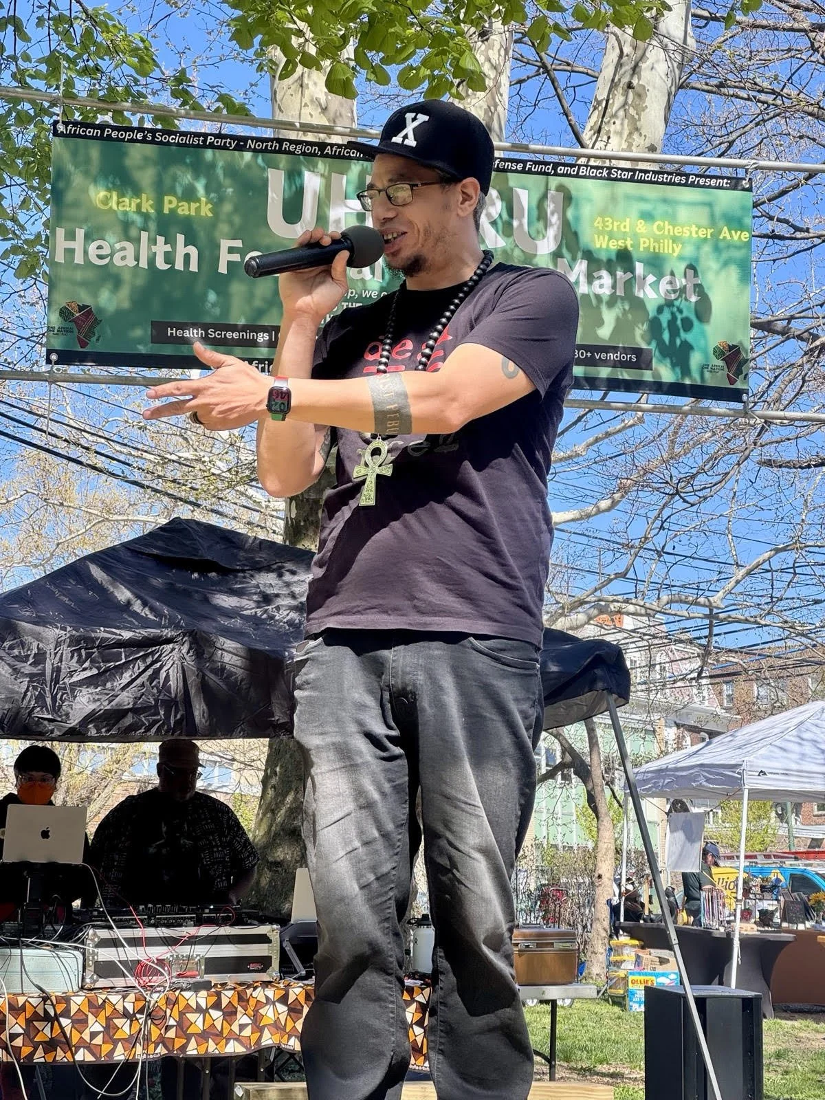 Ismael Jimenez speaking at the Uhuru Marketplace in Clark Park.